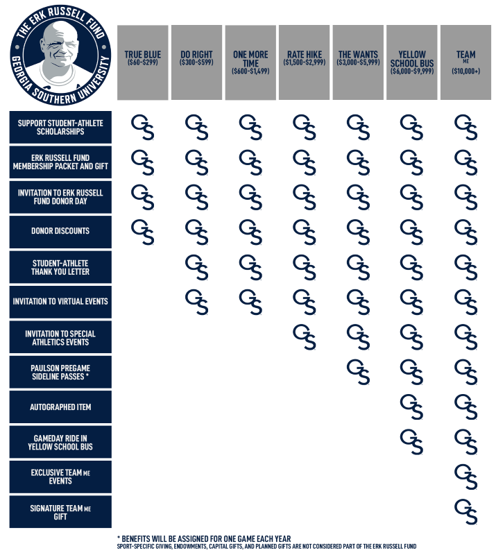 Get 5 friends to join the Erk Russell Fund between now and June 30, 2024 and we will level up your 2024-25 Erk Russell Fund Membership to the next level for free! Do you want to hangout on the sidelines for a game? Want invitations to exclusive GS Athletics events? See the benefits chart below to see just how much you can earn when you refer an Eagle!